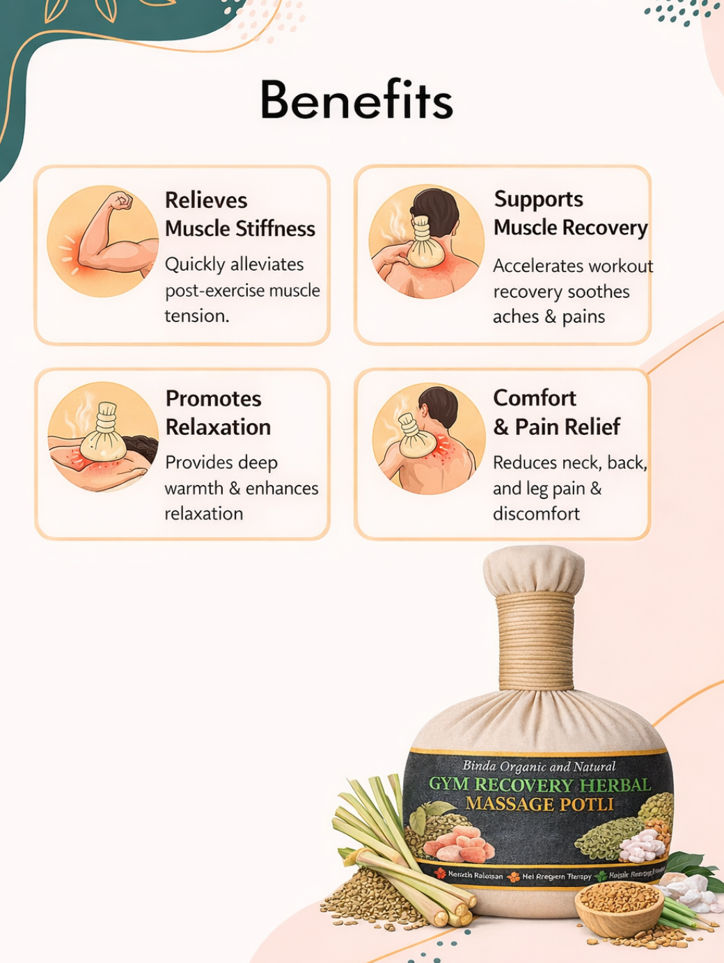 - Reusable & Chemical-Free Herbal Potli – Crafted with natural ingredients, free from harmful chemicals, and suitable for regular external use.