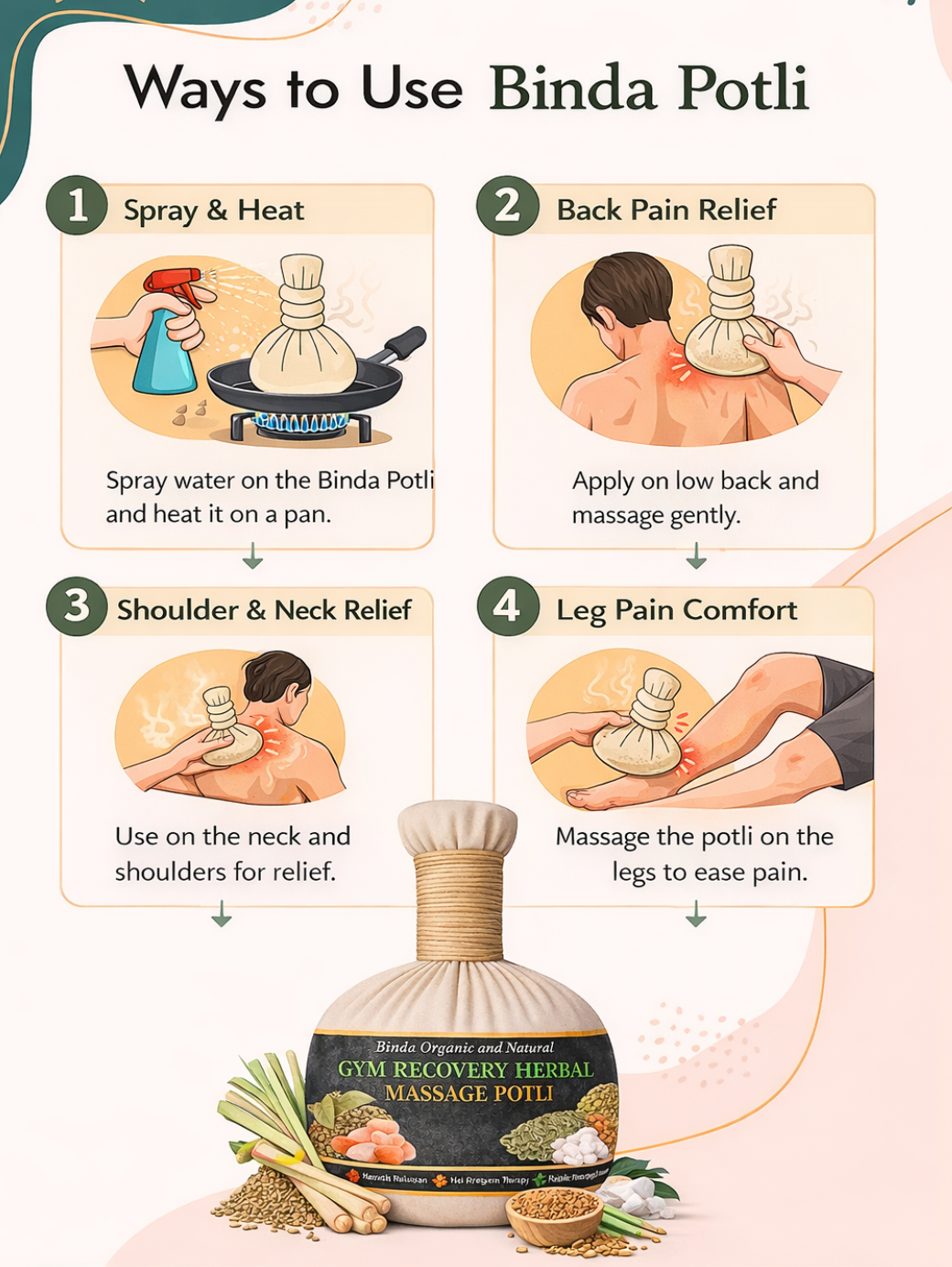 | Yoga, Sports | Back, Neck, Shoulder & Leg Pain | Gym Recovery Herbal Massage Potli is a powerful Ayurvedic solution designed to support muscle recovery, pain relief, and deep relaxation after workouts. It is ideal for gym, yoga, sports, running, and intense physical activity, helping reduce muscle stiffness, soreness, and fatigue naturally. This Ayurvedic hot compress massage potli is made with carefully selected herbal ingredients including Sendha Namak, Ajwain, Saunf, Fenugreek Seeds (Methi Dana), Eucalyptus Leaves, Camphor, and Lemongrass. When heated, the potli releases natural warmth and herbal aroma that provides deep heat therapy, helping muscles relax and recover faster. The gym recovery herbal potli is effective for back pain, neck pain, shoulder pain, leg pain, and joint stiffness. Regular use promotes comfort, relaxation, and improved muscle flexibility after workouts. Its reusable and chemical-free design makes it safe for daily external use. Binda Herbal Massage Potli is an ideal choice for people searching for a natural muscle pain relief product, Ayurvedic hot compress, herbal massage potli, or workout recovery solution. Suitable for home use, athletes, fitness enthusiasts, and anyone with an active lifestyle. |